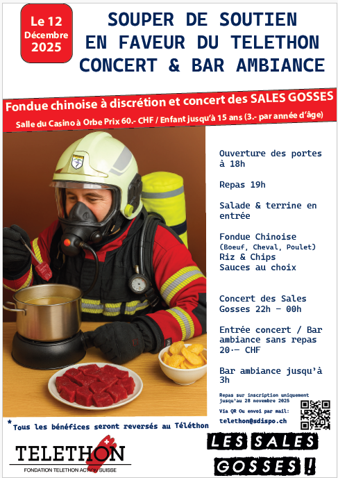 👉 Inscriptions pour le repas / concert via le QR code présent sur le flyer ou par e-mail à telethon@sdispo.ch